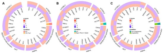 Expression levels on mTOR-associated genes across three distinct datasets. (A–C) The circular heatmaps display relative expression levels for three different datasets ((A): GSE131735, (B): GSE199795, (C): GSE175648), where z-scores of each gene are used for comparison.