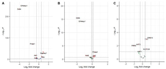 In order to assess the effects of mTOR-associated genes on the three different comparisons, we applied volcano plots to identify significantly differentially detected genes for each dataset as illustrated in Figure 2. On average, around 30% of mTOR-associated genes turned out to be significantly expressed between two different conditions of each dataset. DDIT4 and EIF4EBP1 displayed similar significant differential regulation for the two mouse models (A: GSE131735 and B: GSE199795), while AKT2 showed the abnormal discrimination between the mice (B: GSE199795) and the patients (C: GSE175648). Although having unimpressive significance, only AKT1 demonstrated differential expres-sion levels across all three datasets by having statistics as follows: (i) GSE131735: logFC (4th) and p-value (4th), (ii) GSE199795: logFC (6th) and p-value (3rd), (iii) GSE175648: logFC (8th) and p-value (5th).