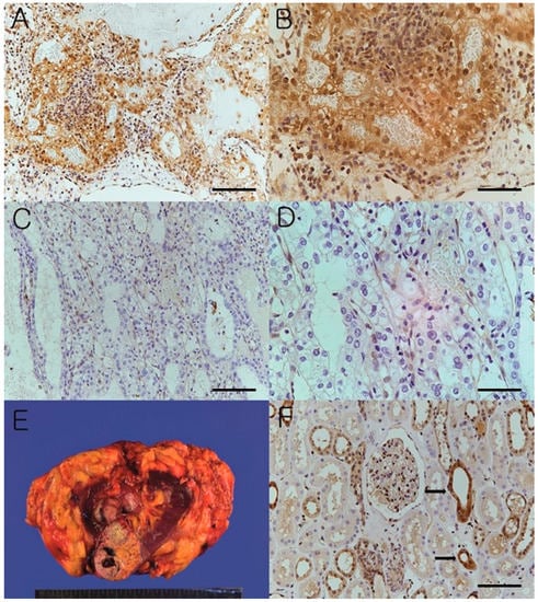 Microscopic and gross features of clear cell renal cell carcinoma. Representative photographs of high AKT1 expression ((A), ×200). The high AKT1 expression was seen in both nuclei and cytoplasm of carcinoma cells ((B), ×400). Representative photographs of low AKT1 expression. This case showed weakly focal AKT1 expression in only a few carcinoma cells ((C), ×200). Magnified view ((D), ×400). Representative gross photograph of clear cell renal cell carcinoma. Relatively well circumscribed mass with cystic, solid, and hemorrhagic areas is observed in interpolar area (E). Photographs of AKT1 expression in normal kidney ((F), ×200). The distal convoluted tubules (Black arrow) and some glomerular mesangial cells showed high AKT1 expression in normal kidney. Scale bar is 20 µm for ×200, and 40 µm for ×400.