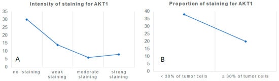 Graphs according to intensity (A) and proportion (B) regarding AKT1 expression results obtained by immunohistochemistry.