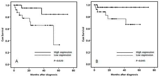 After analyzing the clinicopathological characteristics, WHO/ISUP grade was lower in high expression of AKT1 (p = 0.040) while the TNM stage, however, did not show significant results. Recurrence-free survival and progression-free survival were significantly better in high expression of AKT1 than that in low expression of AKT1 (p = 0.020, p = 0.045, Figure 6).