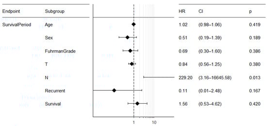Multivariate survival analysis through the Cox proportional hazard model was performed, and the results are presented. In Cox regression analysis, only N stage was observed to be statistically significant among several factors (p = 0.013, Figure 7).