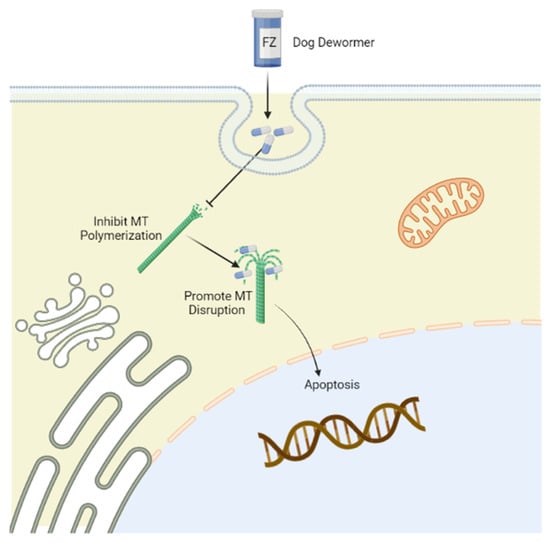 FZ primarily inhibits tubulin polymerization and promotes microtubular (MT) disruption in parasite cells (Figure 1) []. Tubulin, a structural protein of MTs, is the leading molecular target of benzimidazoles [] and has prominent functions in cell proliferation, motility, division, the intercellular transport of organelles, the maintenance of the cell shape, and the secretion process of cells in all living organisms []. By binding with beta-tubulin, FZ blocks MT polymerization in worms and thus perturbs glucose uptake, eventually emptying glycogen reserves and adversely affecting energy management mechanisms. As a result, the whole process eventually contributes to the death of the parasites []. Additionally, the poor absorption of FZ from the intestine manifests as reduced levels of drugs and their active ingredients in tissues compared with those within the gut, where the targeted parasites are present [].