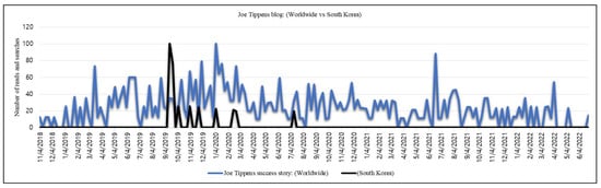 Comparative reading of Joe Tippens’ blog. The number indicates the average number of reads and searches for the use of fenbendazole as an anticancer drug after the release of Tippens’ story. A volume of 100 indicates the highest number, while 0 indicates the lowest. The data were collected using Google Trends and Naver Data Lab (South Korean search engine).