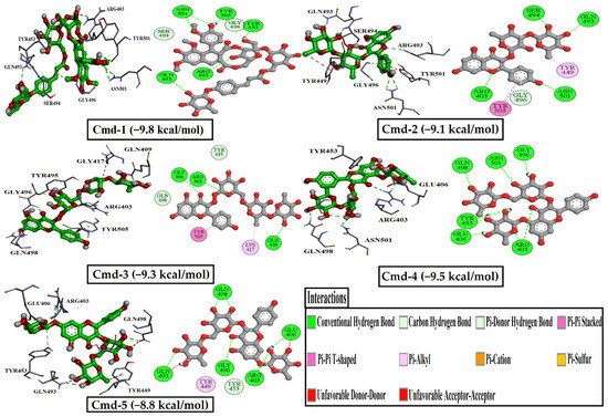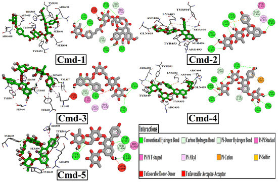 In detail, Cmd-1 (docking score = −9.7 kcal/mol) formed a carbon-hydrogen bond with SER494 (3.35 Å), and SER 496 (3.75 Å). Interaction of pi-pi stacked type with TYR501 (4.74 Å). Interaction of pi-alkyl with TYR501 (4.45 Å) and HIS505 (4.57 Å). Cmd-1 formed six conventional hydrogen bonds with ASP405 (2.28 Å), ARG408 (2.80 Å), TYR453 (2.86, 3.13 Å), ARG498 (3.31 Å), and TYR501 (3.10 Å). Cmd-2, with a docking score of −9.5 kcal/mol, exhibited a featured pi-cation interaction with LYS403 (4.85 Å). It also formed pi-pi stacked and pi-alkyl interactions with TYR501 (5.50 Å) and ARG493 (4.58 Å), respectively. It also formed a carbon-hydrogen bond with SER496 (3.71 Å), a pi-donor hydrogen bond with the same residue at 4.02 Å, and several conventional hydrogen bonds with the following residues: LYS403 (2.99 Å), ASP406 (2.02 Å), GLN409 (3.08 Å), TYR453 (3.06 Å), SER494 (3.22 Å). Cmd-3, with a docking score of −9.2 kcal/mol, interacted with TYR501 in two ways: pi-pi stacked (4.41 Å) and pi-pi T-shaped (4.84 Å). It also interacted with HIS505 in a pi-pi T-shape (4.21 Å). Pi-alkyl interaction was observed with three different amino acid residues, VAL417 (4.29 Å), TYR453 (4.83 Å), and LEU455 (5.10 Å). It formed three main conventional hydrogen bonds with the following residues: LYS403 (3.22 Å), GLN409 (2.83 Å), and VAL417 (3.27 Å). Cmd-4 and Cmd-5 obtained the same docking score (−9.0 kcal/mol). However, they interacted with different residues inside the binding pocket. As in Cmd-2, Cmd-4 also showed pi-cation interaction with LYS403, but at different distances. Cmd-4 recorded one pi-pi T-shaped interaction with TYR453 (5.62 Å) and one pi-donor hydrogen bond with the same residue at 3.98 Å. One Carbon-hydrogen bond was detected with ARG493 at 3.67 Å. Cmd-4 exhibited eight conventional hydrogen bonds with ASP406 (2.13 Å), ARG408 (2.92 Å), GLN409 (2.90 Å), TYR449 (2.45 Å), SER496 (3.01 Å), ARG498 (3.09 Å), and TYR501 (2.75, 3.13 Å). Regarding Cmd-5, TYR453 and SER496 were detected as the main residues of interaction as they formed three conventional hydrogen bonds and three carbon-hydrogen bonds, respectively. One pi-donor hydrogen bond was noticed with TYR501, one pi-pi stacked interaction with the same residue, and one pi-pi-T-shaped interaction with HIS505 was also detected.