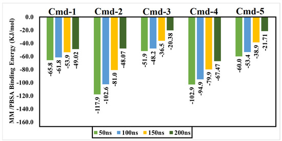 With respect to data from 200 ns MD simulation, Cmd-1 and Cmd-2 obtained binding energies of over −45.0 kJ/mol, whereas Cmd-4 had the highest stability compared to others, with a binding energy value of over −65.0 KJ/mol.
