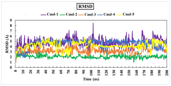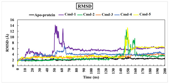 Throughout the 200 ns MD simulations, the estimated RMSD values for Cmd-2 were found to be 2.81 Å with a difference of 0.51 Å from the apoprotein structure (2.30 Å). As well, Cmd-3, Cmd-4, and Cmd-5 obtained an average RMSD of 3.22, 3.87, and 3.96 Å, respectively. In contrast, Cmd-1 showed higher values of RMSD (avg. = 5.53 Å), which reflects the occurrence of some positional or conformational changes. As shown in Figure 6, the ligand movement for Cmd-2 and Cmd-3 within the binding pocket reflects the RMSD value, which is the lowest compared to the rest of the compounds.