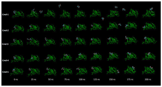 Snapshots for the movement of the studied five compounds inside the binding cavity of Omicron BA.1 during the MD simulation period.