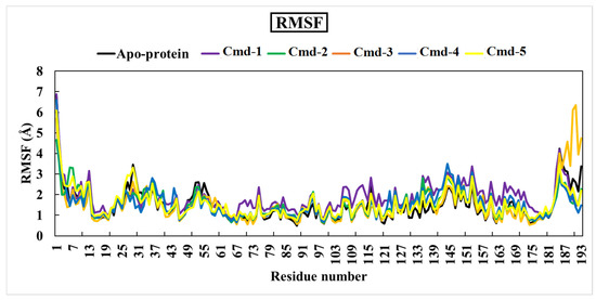 The averages values of RMSF for apoprotein structure, Cmd-1, Cmd-2, Cmd-3, Cmd-4, and Cmd-5 were 1.50, 1.86, 1.53, 1.54, 1.55, and 1.57 (Å), respectively.