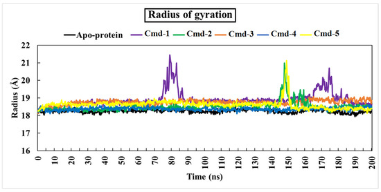 The radius of gyration (Rg) is a parameter that shows how the protein’s structural compactness changes during simulation [65]. An Rg analysis reflects the protein’s flexibility and stability [65]. Protein has the lowest Rg values and, as a result, the tightest packing and the most stability.
