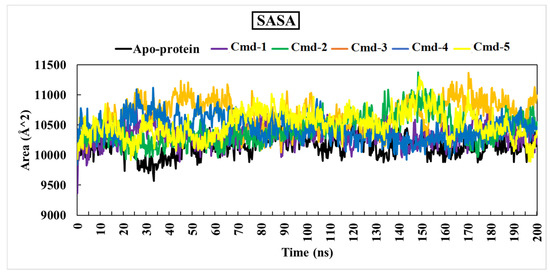 Solvent-accessible surface area analysis (SASA) was computed to obtain a deeper insight into interactions between the complex and the solvent throughout the 200 ns MD simulation. Figure 9 depicts the SASA vs. simulation time curve for apoprotein and five complexes.