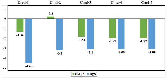 Evaluation of molecular features should be carried out through the inspection of many parameters. For instance, drug solubility (logS) is a crucial element that influences drug transport from the site of administration into the bloodstream. It is also well recognized that low medication solubility can result in poor absorption. The logS value should be greater than −4.0. The second factor is the partition coefficient between n-octanol and water, cLogP, which is used to determine the molecule’s hydrophilicity. For the molecule to be well absorbed, values of cLogP should be in the range of −4.0 to 5.0. Figure 10 illustrates the estimated values of logS and cLogP for the five inspected Cmds. All Cmds are within the allowed range, implying good absorption.