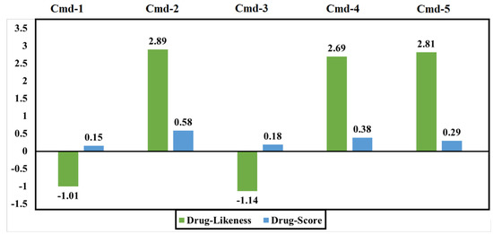 Both Cmd-1 and Cmd-3, which had negative drug-likeness values, had the lowest drug scores when compared to others. Strikingly, Cmd-2 obtained the highest values of drug-likeness and drug score when compared to other Cmds.