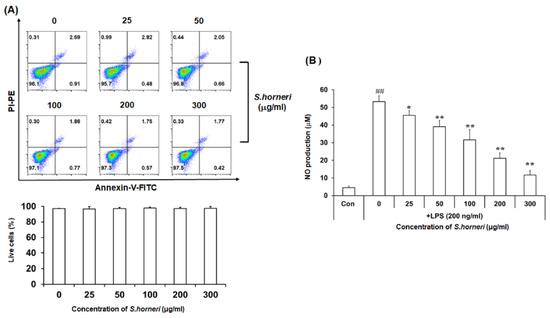 Anti-neuroinflammatory effect of S. horneri extract on NO production in LPS-stimulated BV-2 microglial cells. Microglial cell viability was determined by Annexin-V/PI assay after S. horneri extract treatment with BV-2 microglial cells (A). After S. horneri extract treatment of BV-2 microglial cells stimulated with LPS (200 ng/mL), NO production ability was determined by Griess assay (B). The result is representative of three repeated independent experiments. Experimental results were indicated as mean (±SE). * p <0.005, ** p < 0.001, significantly different from LPS-treated group; ## p < 0.001, significantly different from LPS-untreated group.