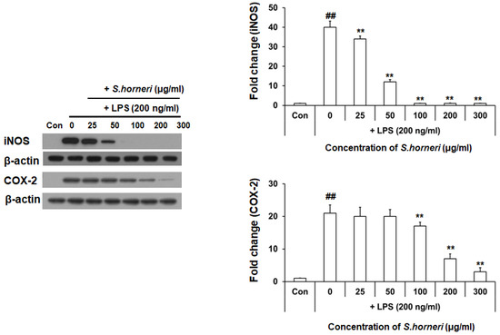 Since S. horneri extract inhibits NO production, we assessed its impact on protein expression of iNOS, which is a pro-inflammatory enzyme producing NO and cyclooxygenase (COX)-2. Western blot analysis was performed to confirm that S. horneri extract inhibits the expression of pro-inflammatory enzymes. BV-2 microglial cells were pretreated for 2 h with S. horneri extract and then stimulated with LPS (200 ng/mL) for 22 h. As shown in Figure 2, protein levels of iNOS and COX-2 were also decreased in BV-2 microglial cells pretreated S. honeri extract (0–300 µg/mL) for 2 h, even though expression of both proteins was stimulated by LPS treatment. These results indicate that S. horneri extract inhibits protein expression of iNOS and COX-2 in LPS-stimulated BV-2 microglial cell.