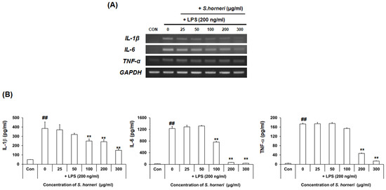 Effect of S. horneri extract on the production levels of IL-1β, IL-6 and TNF-α in LPS-stimulated BV-2 microglial cells. S. horneri extract was pretreated with BV-2 microglial cells 2 h and then incubated with 200 ng/mL LPS for 6 h. RNA was isolated and analyzed by RT-PCR. IL-1β, TNF- α and IL-6 gene expression was confirmed, respectively (A). The cells were pre-treated with S. horneri extract (25, 50, 100, 200 and 300 μg/mL) for 2 h, followed by treatment of LPS (200 ng/mL) for 24 h; the levels in the supernatants were measured by ELISA (B). Each bar indicates the mean ± SE of four independent experiments. ** p < 0.001, significantly different from LPS-treated group; ## p < 0.001, significantly different from LPS-untreated group.