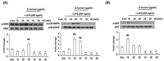 S. horneri attenuated LPS-induced MAPK phosphorylation and NF-κB translocation. Cells were pre-treated with 300 μg/mL of S. honeri for 2 h, followed by treatment of LPS (200 ng/mL) for 15, 30 and 45 min. The expression of phosphorylated proteins was measured by Western blot. The total extracts and nucleus extracts were assayed with antibodies specific for p-ERK, p-38 MAPK and p-p65 (NF-κB). Total form and β-actin were used as internal control for total fraction. The blots are representative of three independent experiments (A,B). Each bar indicates the mean ± SE of four independent experiments. ** p < 0.001, significantly different from LPS-treated group; ## p < 0.001, significantly different from LPS-untreated group.