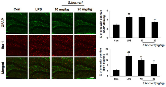 Microglia and astrocyte activation is important in neuroinflammatory responses. It also induces various CNS injuries, such as Alzheimer’s and Parkinson’s disease [25]. Therefore, in order to determine the inhibitory effect of S. horneri on neuroinflammation, we analyzed microglia and astrocyte activation by S. horneri administration in LPS-challenged mice. As shown in Figure 5, we found that microglia and astrocyte were activated in the group treated with LPS. However, microglia and astrocyte activation were significantly inhibited in the 20 mg/kg S. horneri pretreatment group. This result suggests that S. horneri has a preventive effect on neuroinflammation in an animal model.