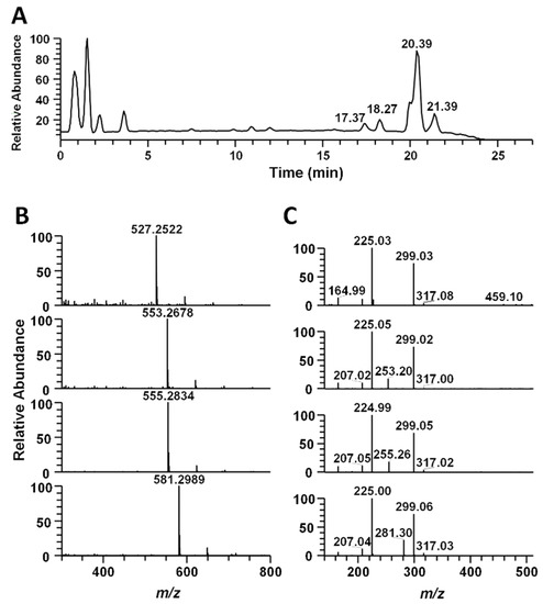 The high-resolution UPLC-MS/MS result of ethanol extract of marine brown alga S. horneri. (A) Mass chromatogram of the ethanol extract at negative ion mode. (B) High-resolution mass spectrum of 4 sulfoglycolipid compounds at retention times 17.37, 18.27, 20.39 and 21.39 min. (C) Tandem mass spectrum of each of the 4 sulfoglycolipid compounds (m/z 527.2522, 553.2678, 555.5834 and 581.2989).
