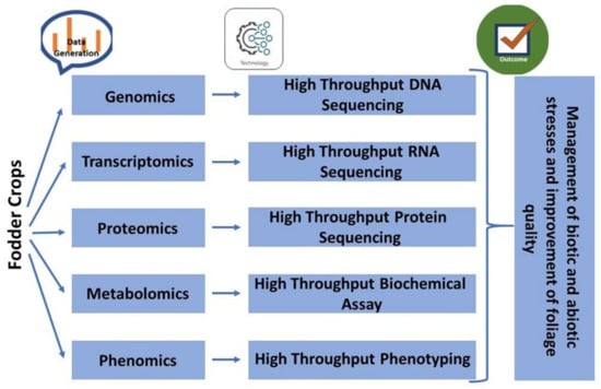 The integration of multi-omics has been successfully performed for yield increment and biotic and abiotic stress tolerance/resistance development in agricultural crops (Figure 2). However, in fodder crops, in the recent past, a handful of studies have been conducted in crop plants using molecular biology approaches of different omic technologies, including genomics, transcriptomics, proteomics, metabolomics, and phenomics [,,,,,], to achieve higher yields along with quality fodder (Figure 3).