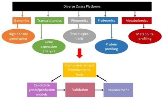 With the increasing challenges in agriculture, we also have great opportunities, especially with booming advances in omic technologies. Advancements in biotechnology and computational sciences have made it feasible to generate omics data for large sets of plants, varieties, or species at a reasonable price []. Handling and analyzing large and complex omics data has become possible with the availability of advanced computation and bioinformatics tools. The use of different omics led to the identification of genes, their functions, type of RNA or protein involved, their structure, and pathway involved in the appearance of the final morphological character [] (Figure 1). Comparative omic analysis of different regions of varying environmental conditions makes it possible to identify genes essential for adaptation []. Identified genes can be manipulated or transferred to develop new hybrids or varieties with desirable characteristics.