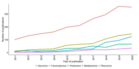 Graphical presentation showing the trend of publications mentioning omic approaches to improve fodder crops in the last decade. The search was made using the associated omics technique and the crop name keyword in the abstract. Source: PubMed, dated 5 August 2022.