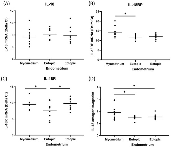 IL-18 mRNA determined by real-time quantitative PCR in paired tissue of patients with adenomyosis. According to CT value quantification and 2−∆∆Ct method, (A) IL-18 was similar among the tissues from eutopic, ectopic endometrium, and corresponding myometrium; (B) IL-18BP was significantly lower in corresponding myometrium than those in eutopic endometriu; (C) IL-18R was significantly lower in ectopic endometrium and corresponding myometrium in comparison to eutopic endometrium; (D) an increased ratio of IL-18 antagonist to agonist in ectopic endometrium compared with corresponding myometrium is demonstrated that IL-18 system may play a critical role in regulating immune response and suppressing the rejection of eutopic endometrium implantation at the level of EMI. * p < 0.05.
