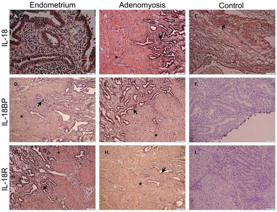 Immunohistochemistry of IL-18 system in patients with adenomyosis. A brown stain indicated a diffuse IL-18 system positive reaction in luminal epithelium (arrow) and stromal cells (star) of eutopic (A,D,G) and ectopic (B,E,H) endometrium. The human placenta was a positive control of IL-18 (C). Negative control was also presented by omitting the primary antibodies of IL-18BP (F) and IL-18R (I). (A) scale bar = 20 μm; (B–I) scale bar = 100 μm.