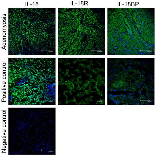 Immunofluorescence of IL-18 system in patients with adenomyosis. The expression of IL-18 system (green) is located in the cytoplasm of both glandular and stromal cells. The human placenta was a positive control of IL-18. The study samples from patients with adenomyosis showed significant overexpression of IL-18 system proteins, indicating the presence of IL-18 system may act as a local immunomodulator in adenomyosis. Scale bars = 150 μm.