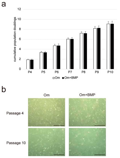 Population doubling (PD), a method of calculating proliferative capability, was performed for each subculture using the following equation: PD = [log10(NH)-log10(N1)]/log10(2); where, N1 is the inoculum number, NH is the cell harvest number, and log is logarithm []. The calculated PD increase was added to the PD level of the previous passages to yield the cumulative PD level. First, NHNCs were maintained in the Om (Om group); then, to examine the effect of E-BMP-2 on proliferation, NHNCs were cultured in Om supplemented with 100 ng/mL E-BMP-2 (Om + BMP group). Histological images in both groups were visualized on day 7 at passages 4 and 10 using a BZ-X700 microscope (Keyence, Osaka, Japan).