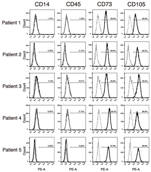 Flow cytometric analysis of the expression of cell surface markers of non-hypertrophic nonunion cells (NHNCs). Gray dotted lines are isotype control. Positive percentage of the cell surface is shown in each histogram.