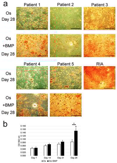 The ALP activity increased with time in both groups, although there were no significant weekly differences in the Os group (p = 0.070). In contrast, the ALP activity was significantly higher on day 28 than on day 7 in the Os + BMP group (p = 0.017). In addition, on day 28, the ALP activity in the Os + BMP group was significantly higher than that in the Os group (p = 0.016, Figure 4).