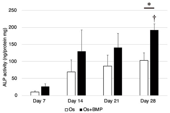 Analysis of the alkaline phosphatase (ALP) activity of non-hypertrophic nonunion cells (NHNCs). ALP activity of NHNCs in osteogenic medium (Os) and Os with E-BMP-2 (Os + BMP) on days 7, 14, 21, and 28. * p < 0.05 in the indicated group and † p < 0.05 compared with day 7 results in Os + BMP group.