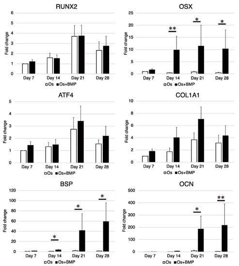 Analysis of the expression of osteoblast-related genes in non-hypertrophic nonunion cells (NHNCs). Real-time reverse transcription-polymerase chain reaction (RT-PCR) for runt-related transcription factor 2 (RUNX2), osterix (OSX), activating transcription factor 4 (ATF4), collagen type I (COL1A1), bone sialoprotein (BSP), and osteocalcin (OCN) in the total RNA extracted from NHNCs in osteogenic medium (Os) and Os with E-BMP-2 (Os + BMP) on days 7, 14, 21, and 28. NHNCs incubated in Os for 7 days were used as the control. * p < 0.05 and ** p < 0.01 in the indicated groups.