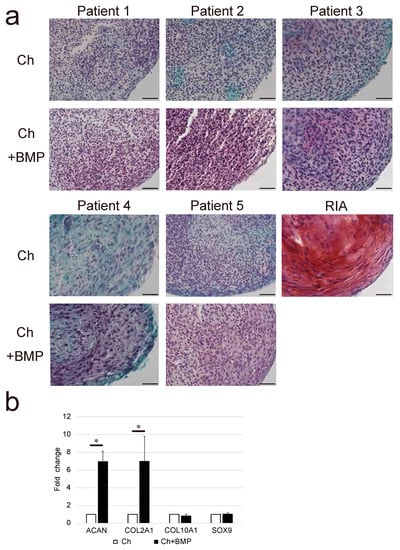 Glycosaminoglycan deposition in the Ch + BMP group was observed as red staining of the extracellular matrix by Safranin-O, although this was negligible in the Ch group (Figure 6a). The expression of ACAN and COL2A1 in the Ch + BMP group was significantly higher than that in the Ch group (both p = 0.005, Figure 6b). However, the expression of COL10A1 and SOX9 did not differ between the groups.