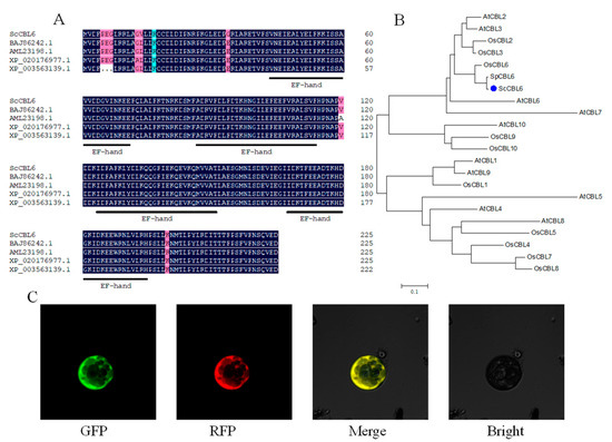 ScCBL6 was cloned from S. capillacea based on its homologue in S. purpurea. After sequencing, an open reading frame of 681 bp was designated as ScCBL6. The full-length gene encodes a putative protein with 226 aa residues. A protein–protein similarity search using the basic local alignment search tool against the National Center for Biotechnology Information (NCBI) database revealed that ScCBL6 shared the highest identity (98.67%) with calcineurin B-like protein 6 in Hordeum vulgare subsp. vulgare (accession no. BAJ86242.1), followed by 98.23% identity with calcineurin B-like protein in S. purpurea (accession no. AML23198.1), 98.23% identity with calcineurin B-like protein 6 in Aegilops tauschii ssp. tauschii (accession no. XP_020176977.1), and 97.35% identity with calcineurin B-like protein 6 in Brachypodium distachyon (accession no. XP_003563139.1) (Figure 1A). These proteins shared four classical EF hands in a Motif Scan analysis. ScCBL6 clustered with OsCBL6 in a phylogenetic analysis (Figure 1B), and the subcellular localizations of the ScCBL6 protein primarily included the tonoplast and plasma membrane (Figure 1C).