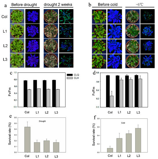 Seedling growth and survival of ScCBL6-overexpressing (ScCBL6-OXP) and wild-type (WT) plants under drought and cold stress. The upper panels (a,b) indicate the changes in the morphology and photosynthetic efficiency (Fv/Fm) after drought and cold treatment. Left-hand images (green plants) were obtained in live video mode, while right-hand images (blue plants) were observed under fluorescence light. The lower panels (c–f) show the survival rate of different transgenic lines (L1–L3) after controlled drought and cold treatments and are based on at least seven biological replicates.