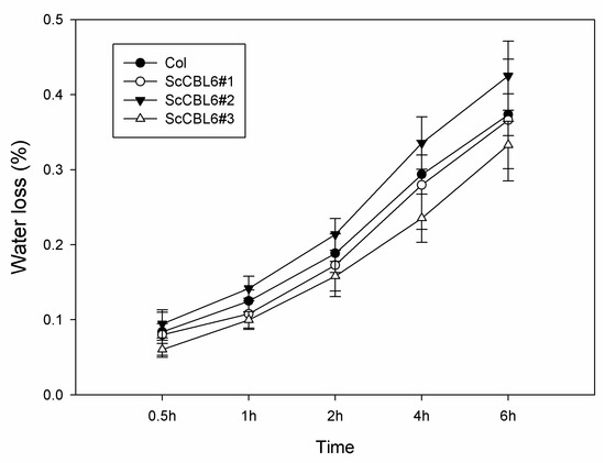 Water loss rate of ScCBL6-OXP and WT leaves. The water loss rate was calculated as the difference between weights at individual timepoints and the original weight. Col, Columbia ecotype Arabidopsis; numbers followed by # denote different transgenic lines of ScCBL6-OXP.