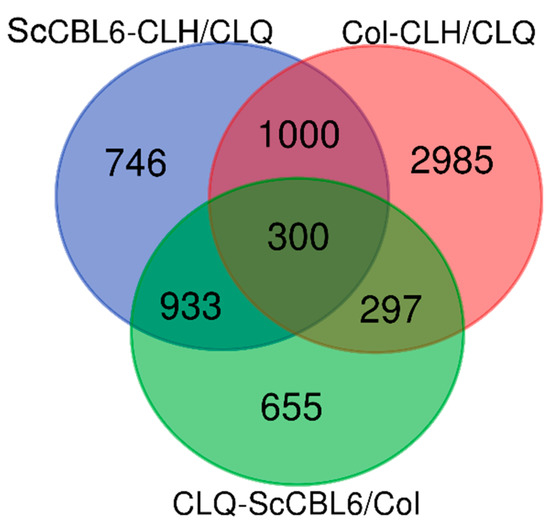 Venn diagram of overlapping and specific differentially expressed genes (DEGs) under different conditions. CLQ, before cold treatment; CLH, after cold treatment; ScCBL6, ScCBL6-overexpressing Arabidopsis; Col, wild-type Arabidopsis.
