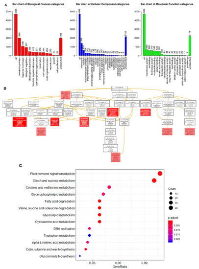 Functional enrichment of ScCBL6-regulated DEGs. (A) Summary of Gene Ontology (GO) annotation classified into three principal categories. (B) Directed acyclic graph of GO enrichment of DEGs. The colors in different boxes indicate significant level of FDR. (C) Kyoto Encyclopedia of Genes and Genomes pathway enrichment of DEGs against the Arabidopsis background set in clusterProfiler.