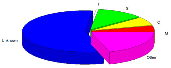 Subcellular localization prediction of DEG expression products. M, mitochondrion (158); S, secretory pathway (472); C, chloroplast (266); T, tonoplast (12); other (799); unknown (2226). Tonoplast-residing proteins were predicted by a BLASTx-based search of proteins identified in previous studies by Endler et al. [40] and Szponarski et al. [41], and other locations were predicted using TargetP.