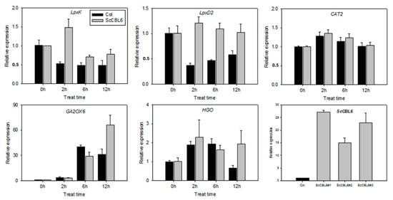 Quantitative reverse transcription-polymerase chain reaction analysis of candidate genes regulated by ScCBL6. The x-axis indicates the duration of cold stress; h, hour. Relative expression level calculated by the 2−ΔΔCT method relative to a non-cold-treated control for each cDNA.