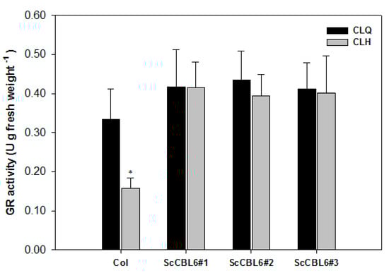 Glutathione reductase activities of the Arabidopsis leaf in response to cold treatment. Asterisk (*) shows significant difference at p < 0.05.
