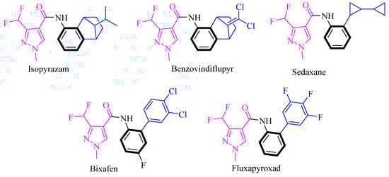 Notably, pyrazole amides have become a hot spot in fungicide research because of their unique mechanism of action, safety, and efficiency [7]. Pesticide companies have developed pyrazole amide fungicides, such as isopyrazam [8], benzovindiflupyr [9], sedaxane [10], bixafen [11], and fluxapyroxad [12] (Figure 1), whose common feature is their connection by benzene rings as bridges.