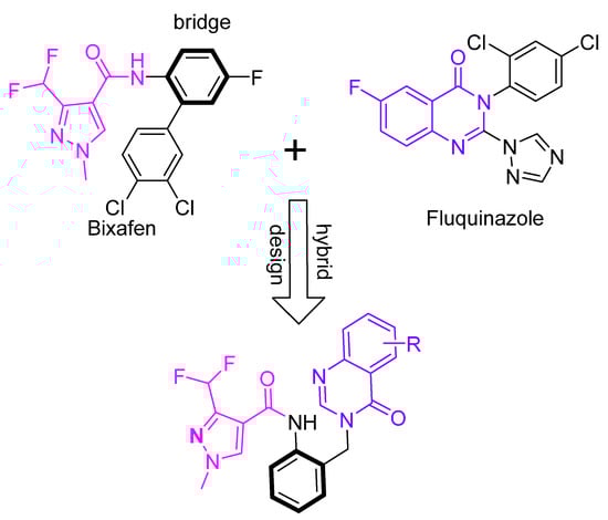 A molecular hybrid is a combination of two or more independently acting pharmacophores that are covalently linked [24]. It can be achieved by linking or by framework integration of two or more molecules to form one molecule with increased pharmacological activity. In this study, a quinazolinone structural unit and a pyrazole-containing active fragment were combined into one molecular structure. The two were connected using a benzene ring and used to design and synthesize a series of quinazolinone-containing pyrazole carboxamide derivatives (Figure 3). The molecular structure of the hybrid molecule was determined using 1H NMR, 13C NMR, and HRMS, followed by a preliminary screening of its antifungal activity in vitro. Subsequent physiological assays of compounds with high antifungal activity against R. solani, which causes sheath blight in rice, were further conducted.