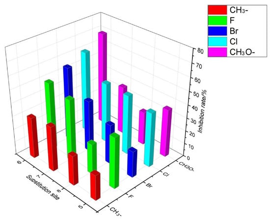 Figure 5 shows the results of the structure–activity relationship analysis. The trend of the inhibitory activity against R. solani was highest when the quinazolinone of the target compounds was substituted with a bromine atom at substitution site 6. Notably, the same trend of antifungal activity was maintained when F-, Cl-, and CH3O- were substituted at different sites with a bromine atom. The fungal activity inhibition trend was 6-CH3O > 6-Cl > 6-Br- > 6-F > 6-CH3 when the substitution site was at position 6. In addition, the number and position of the substituent atoms affected the antifungal activity. For example, the structural differences of 6a12, 6a13, 6a14, 6a15, and 6a16 were at different positions and quantities of chlorine atoms, and their inhibition rates were 41.43%, 61.93%, 45.90%, 45.43%, and 100%, respectively. The antifungal activity at 6,8-diCl > 6-Cl > 7-Cl≈8-Cl > 5-Cl indicated that the position and number of chlorine atoms directly affected the antifungal activity.
