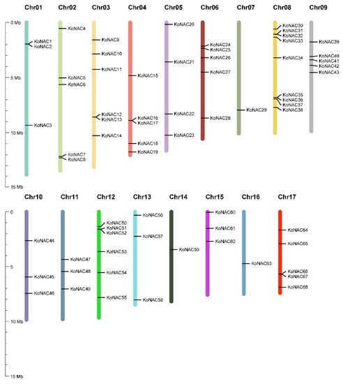 Distribution of KoNAC genes in K. obovata genome. The 68 KoNAC genes were unevenly distributed on 17 chromosomes (Chr01–Chr17) denoted in different colors, while no KoNAC gene was found on Chr18. Values on the y-axis indicate the chromosome length and gene position.