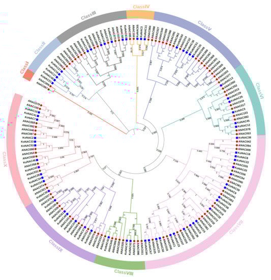Phylogenetic analysis of the NAC proteins from K. obovata and A. thaliana. The unrooted tree was constructed by MEGA 7.0 based on the neighbor-joining (NJ) method with 1000 bootstrap replications. The NAC proteins of K. obovata (KoNAC) in blue squares, and A. thaliana (AtNAC) in red circles were classified into ten classes represented with different colors.