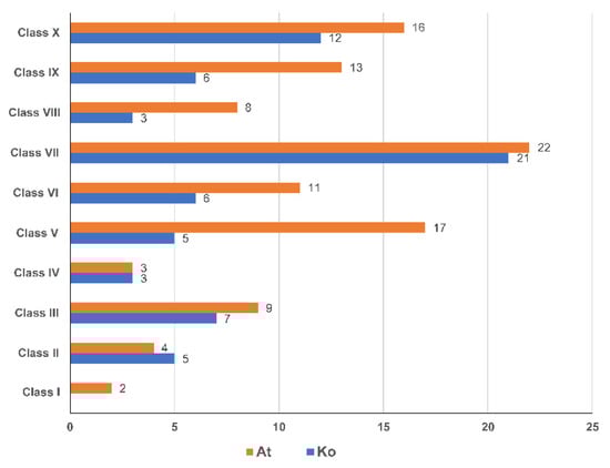 To illustrate the phylogenetic relationship among K. obovata and Arbidopsis thaliana NAC proteins, a neighbor-joining phylogenetic tree was constructed with 68 KoNAC proteins and 105 AtNAC proteins (Table S1). The result showed that the 173 NAC proteins could be classified into ten classes, namely, Class I to Class X (Figure 2). Obviously, Class VII, with 21 KoNACs and 24 ANACs was the largest class, followed by Class X with 12 KoNACs and 14 ANACs. Other classes contained no more than 10 KoNACs each. Specially, no KoNAC belonged to Class I (Figure 3).
