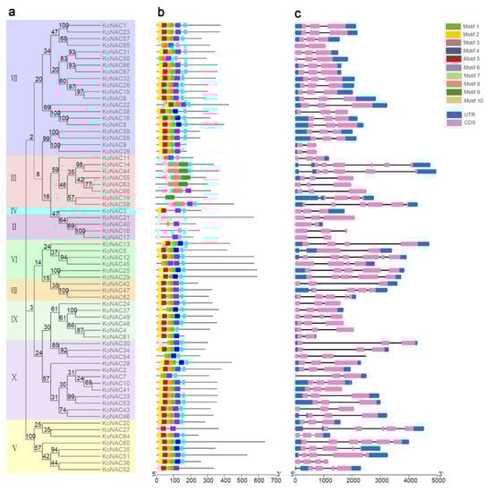 Gene structure and motif organization of the KoNAC genes. (a) The unrooted NJ tree of KoNAC proteins was constructed using MEGA 7.0, while different classes were represented in different colors. Bootstrap values from 1000 replicates are shown on the nodes. (b) Ten different conserved motifs of KoNAC proteins were identified using MEME software. Different colored boxes indicate different motifs. (c) The structures of KoNAC genes are shown, including UTR regions (blue box), exons (grey boxes), and introns (black lines). UTR, untranslated region; CDS, coding sequence of a gene.